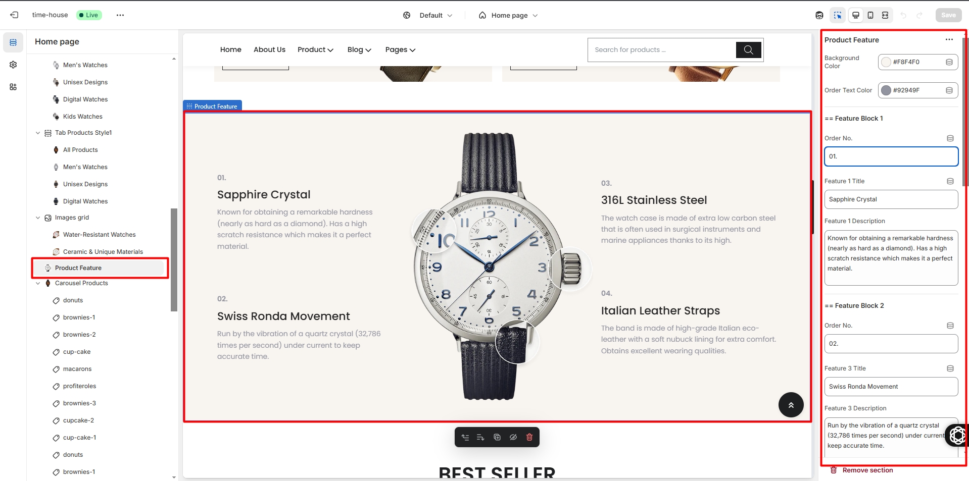 It shows number tab on this section. You can set the attributions of tab on the right panel, it includes the heading, number of products.